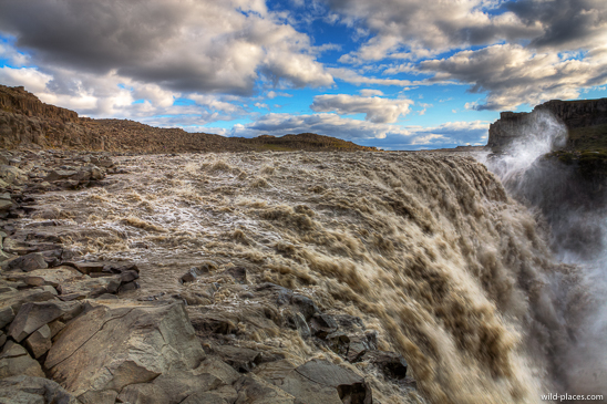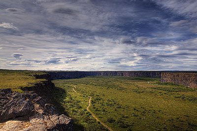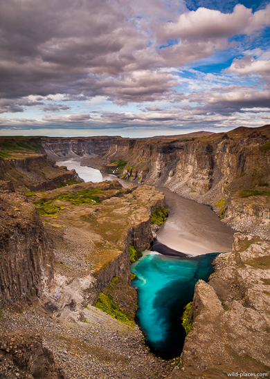 After this hike, we drove to the beautiful lake at the end of the valley. Then we went on the F862 to the other side of the Dettifoss. The view from this side is perhaps even more spectacular. Another short trail led us to Hafragilsfoss. There is a viewpoint, where you can see how clear water of the pure mountain streams is slowly mixed up with the brown-gray sediment of the main stream.