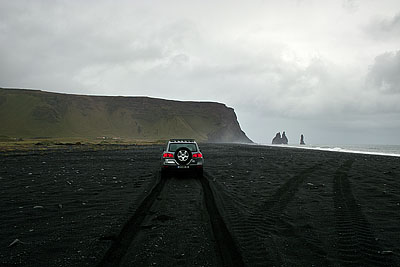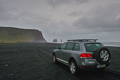 Via the 215 and a short gravel road we reached a pebble beach with fantastic basalt rocks and a cave in the cliff. This beach was also used for advertising the new VW Golf, which was launched in Iceland. Many photos later we went on a jeep track that ran along the beach.