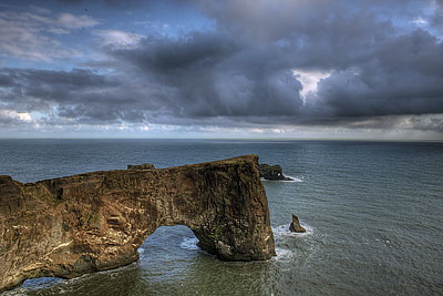 With a little sunshine and lots of rain clouds, we went first to the Reynisfjall, the mountain of Vík. There is a nice gravel road up to the mountain, which can be driven with any SUV. With a 2WD car, you should not drive this route, as there are some large holes and bumps. The view from the top in the direction of Vík is fantastic. On top of the mountain, it, unfortunately, started to rain heavily again. The trail ends at the cliffs in front of Vík, where one can observe puffins in flight. In addition, you have a lovely view of the rock arch of Dyrhólaey.