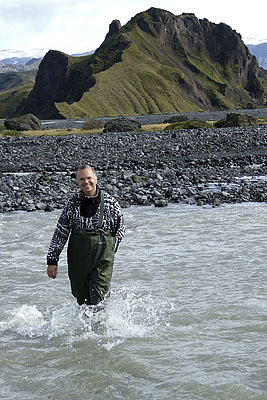 Shortly after the junction to the F910 to Askja, the first deep fords had to be crossed. Due to the glacial sediments in the water, the depth was very difficult to assess. The waders were unpacked for the first time and the ford was inspected for the best line. The depth of the first ford was about 60 cm (to determine the water depths we had brought a large aluminum ruler) and was barely feasible with the Touareg. The caretaker of Nýidalur told us later that the water level on these fords is normally much higher.