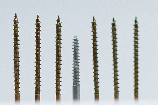 After viewing about 200 test images, I got more and more the impression that the focus with the 50AA was often not 100% correct. After doing some more focus tests, I’m quite sure that there is a problem, limited to a certain range between infinity and MFD. At the extreme points (infinity and MFD) the focus was mostly at the right point but most of the brick wall shots showed some kind of front focus. I did a quick test with some screws (1 cm apart, focus on the middle silver crew, test repeated three times) at a focus distance of about 1.5 m which confirmed my assumption: