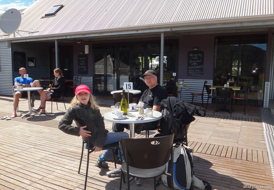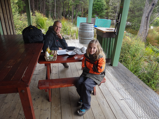 We started the day with breakfast at the Lake Pedder Chalet (raspberry pancakes, eggs Benedict, and cappuccino). After the cold night, Linnéa was enjoying her own (coffee-less) cappuccino at the restaurant.