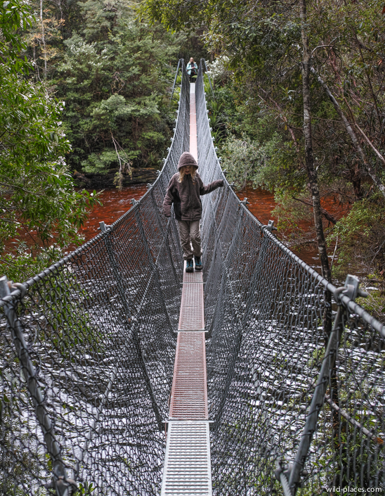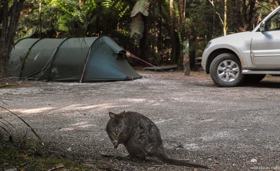 Our next stop was the campground in Corinna. The campsites are beautifully located in dense rainforest in front of the Pieman River with many wild animals like wallabies and possums running around. But the provided wooden platforms were only usable for very small tents. We had to camp on the road with our large tent.