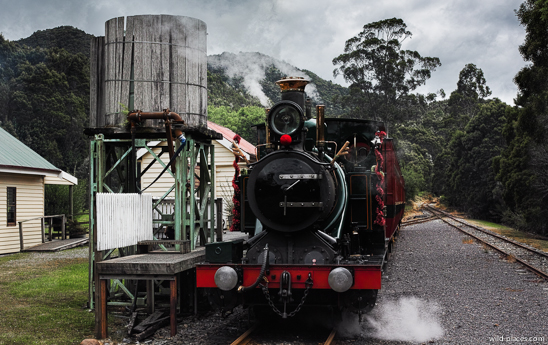 The steam train was used in the past to supply the gold and copper mining towns in the west coast wilderness. Now it is used only for touristic purposes. The train is partly restored and partly build new identical to the old construction. To manage the high inclination in the mountains, especially fully loaded, the train has in addition to the driven wheels a rack-and-pinion drive that can be activated on steep sections.