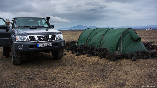 We spent the night at the campground in Hallormsstaður and then entered the eastern highlands via the 910. After some side trips to Snæfell (F909), the Hafrahvammagljufur canyon, and to Hvannalindir (F903) we finally reached the Kverkfjöll campground at the F902.