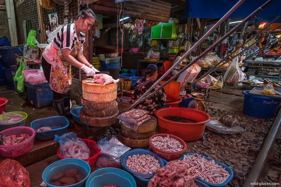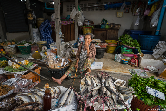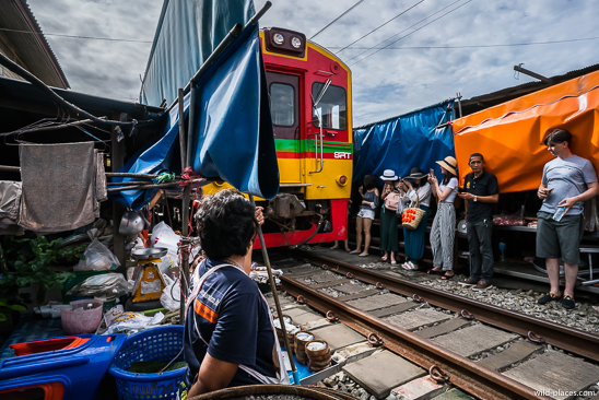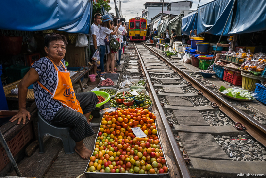 Another very interesting market is the Mae Klong Railway Market. All the goods are offered directly next to the railway track. A few times a day a train passes through this market which is fun to watch and should not be missed.