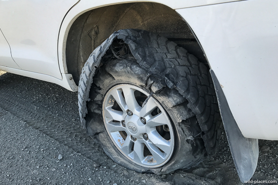 Halfway between Spitzkoppe and Swakopmund on the B2, there was suddenly at about 100 km/h on a paved road a strange noise. Shortly thereafter, the car began to lurch heavily. At first, I didn’t realize what was going on but soon it was pretty clear:
