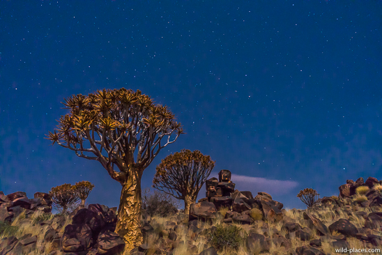 In addition, it was very easy to take a few more starry sky photos right in front of the tent. Since compared to the beginning of our trip the moon had increased quite a bit, the Milky Way was only weakly recognizable anymore. But for the same reason, you could see the landscape and especially the quiver trees in the bright moonlight at night much better. Also hiking at night in the moonlight was now much easier.