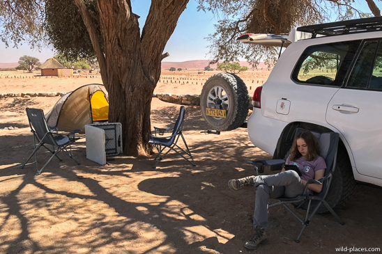 The Sesriem campsite is quite nice. The pitches are very far apart and often Oryx antelopes run directly through the campground. Only when it’s windy, it quickly gets uncomfortable, because a lot of sand flies through the air.