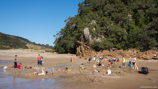 The same can be said for the Hot Water Beach on the Coromandel Peninsula. Two hours before and after low tide you can dig your own hot water pool. Spades can be rented at the cafés next to the car park. It’s fun but you are not alone there.