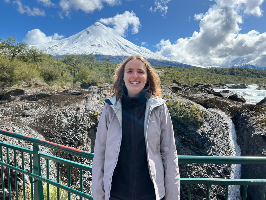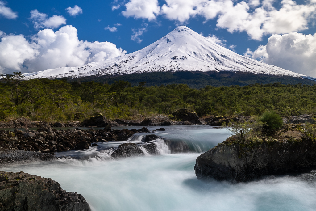 The perfectly cone-shaped Osorno volcano can be seen directly behind the falls. A very unique view.