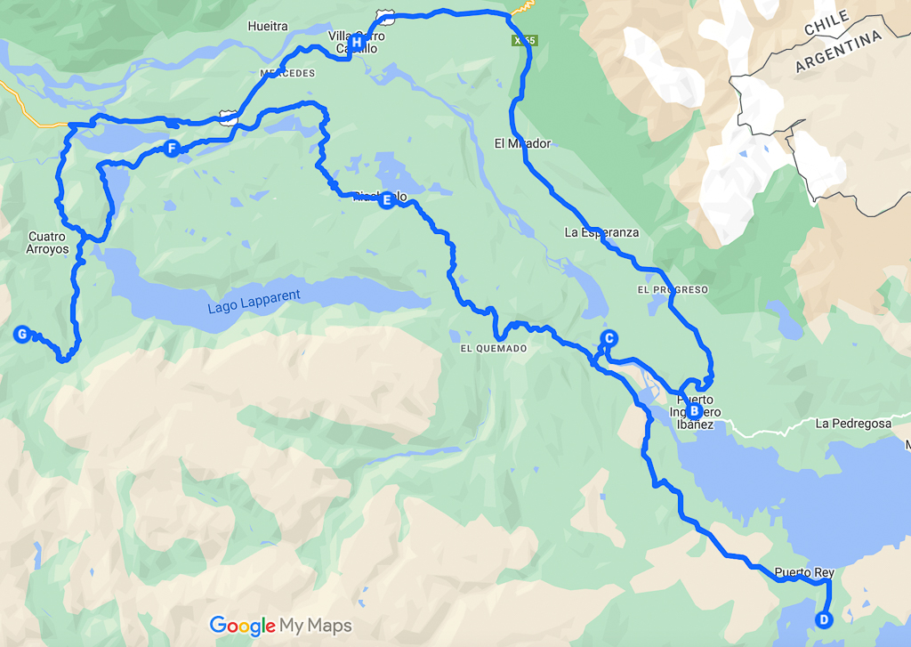 Next, we drove the X-65 from Villa Cerro Castillo to Puerto Ingeniero Ibáñez, a small village at the Lago General Carrera. It’s an easy 37 km drive. Puerto Ingeniero Ibáñez is also the place where Naomi’s ferry from Chile Chico arrived a few weeks ago (see here).