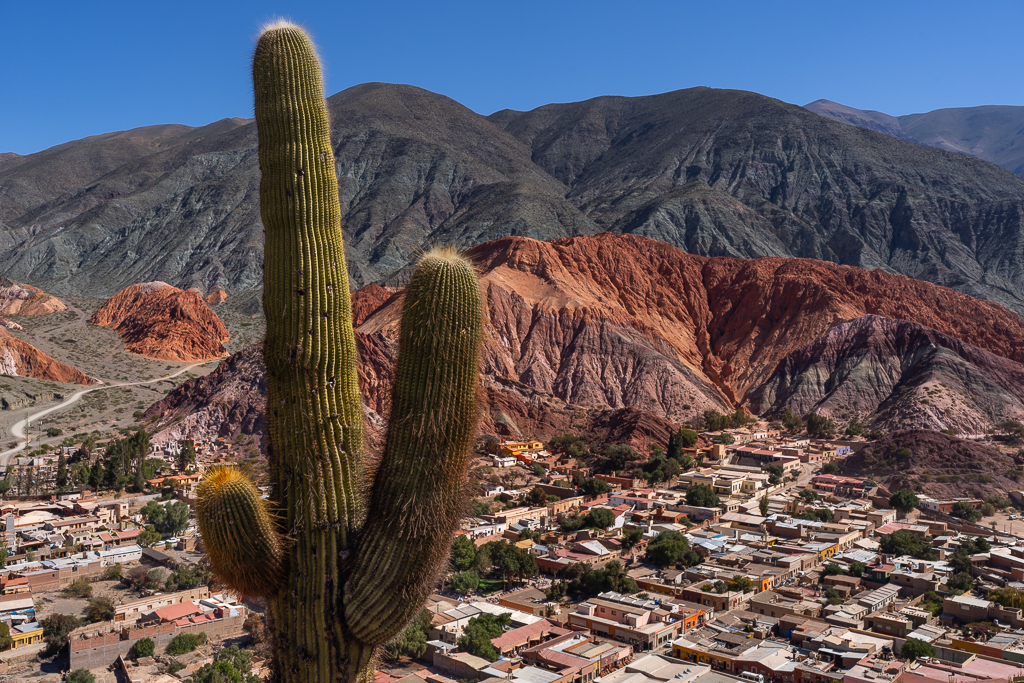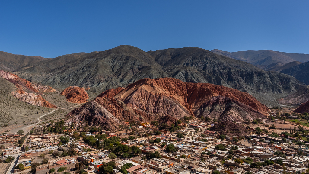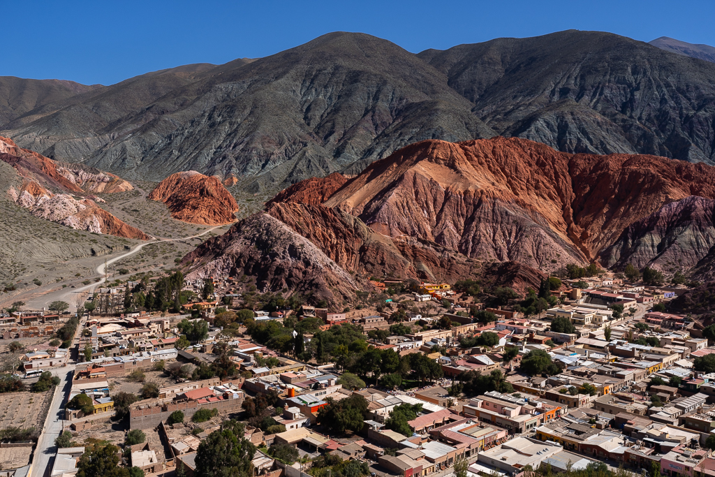 The contrast of the different intense colors is absolutely stunning. On the other side of the Ruta 52 leads a short but steep trail to the Mirador del Cerro de los Siete Colores (the viewpoint of the mountain with seven colors). The view from high above the village is spectacular.