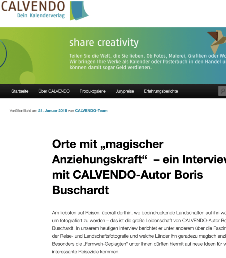 Other Calvendo Interview by Boris Posted on 30 Jan 201610 Jun 2023 Calvendo the publishing company of my print-on-demand-calendars has released an interview with me. You can… Read More